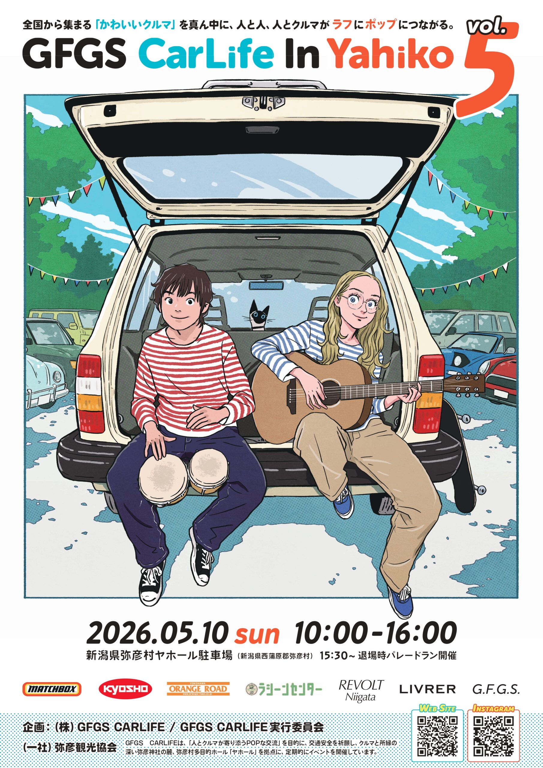 全国から「かわいいクルマ」が弥彦に集結! 5月10日(日)、弥彦村ヤホールを会場に、 人とクルマがラフにポップにつながるイベント「GFGS CarLife In Yahiko vol.5」が開催されます。 会場にはオーナーこだわりの愛車が並ぶほか、グルメ・雑貨・古着・レコードなど16店舗が出店する マーケットや、心地よい音楽ライブも。 車に詳しくない方でも、ピクニック気分で楽しめること 間違いなしです!! 新緑の美しい弥彦をドライブがてら、ぜひ遊びに来てください!日時: 2026年5月10日(日)10:00〜16:00場所: 弥彦村ヤホール 駐車場入場: 無料イベント: 15:30からは退場時のパレードランも開催!