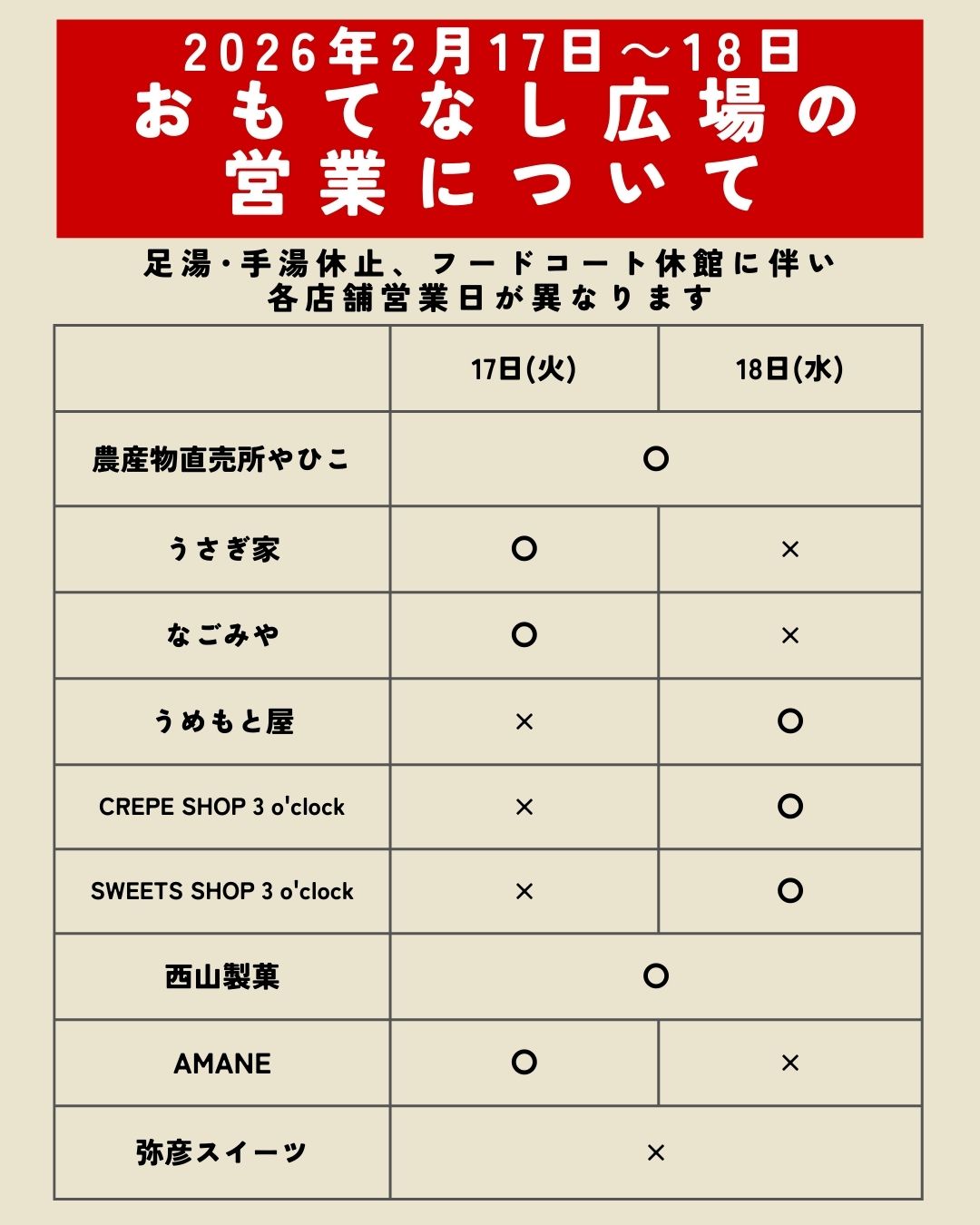 2月17日(火)・18日(水) おもてなし広場各店舗 営業について 2026.02.11 お知らせ 2月17日(火)・18日(水) ・おもてなし広場、手湯・足湯の源泉供給一時停止のため休止 ・(18日のみ)フードコート設備点検による休館 のため 各店舗により営業日が異なります。 営業:〇 休み:✕