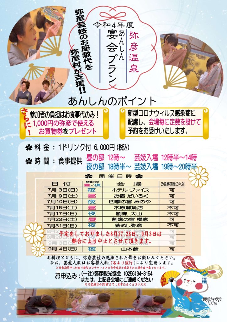8月27.28日、9月3日の弥彦温泉あんしん宴会プランですが、都合により中止とさせて頂きます。