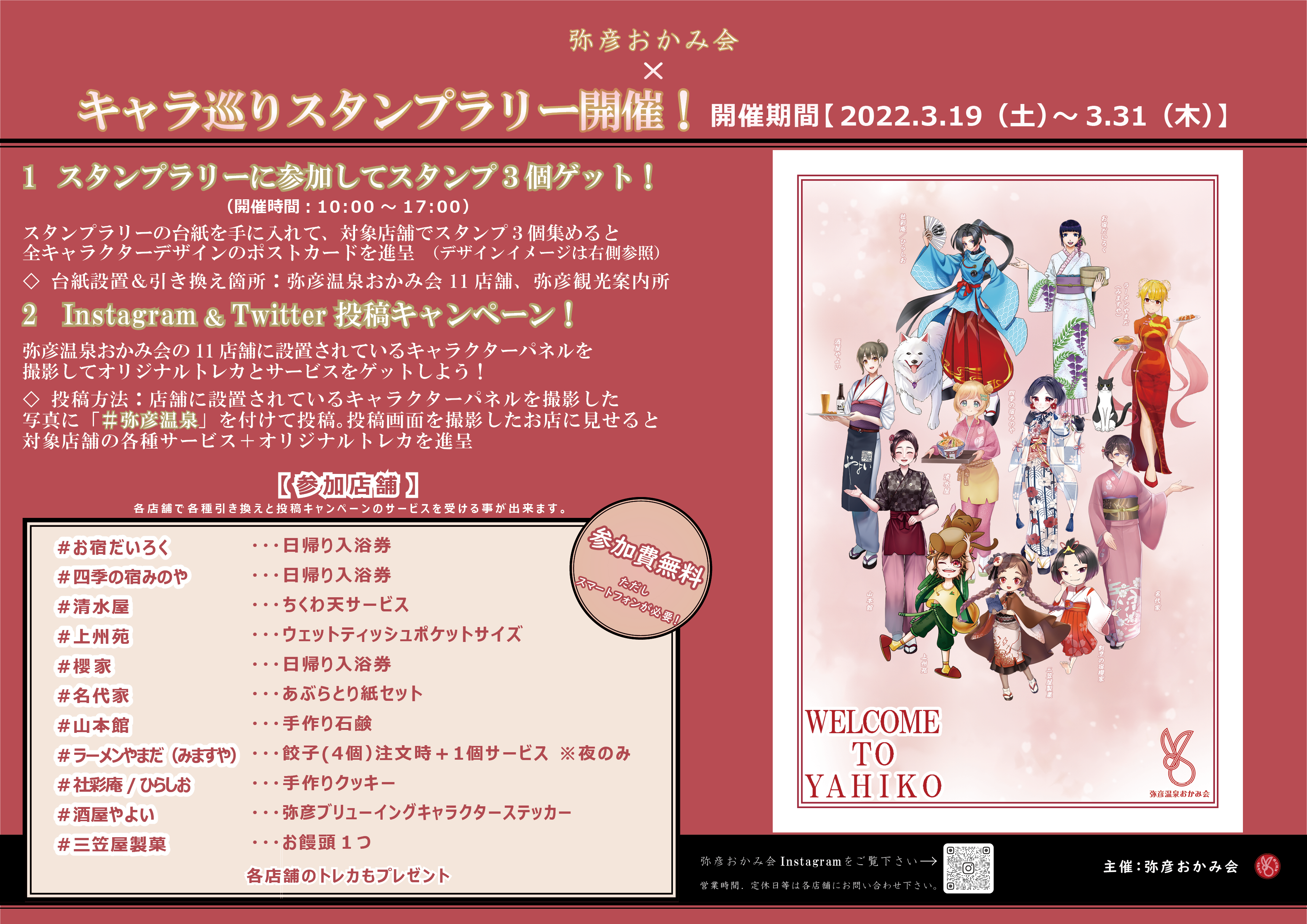 弥彦おかみ会がキャラ巡りスタンプラリーを開催!≪2022.3.19~3.31迄≫ 2022.03.14 お知らせ 弥彦おかみ会が、キャラ巡りスタンプラリーを企画、開催します! 期間中、対象店舗に設置されているキャラクターパネルを撮影してTwitterやInstagramに #弥彦温泉 を付けて投稿! 投稿画面を撮影したお店に見せると対象店舗の各種サービスやオリジナルトレカが貰えます! 是非、参加してください
