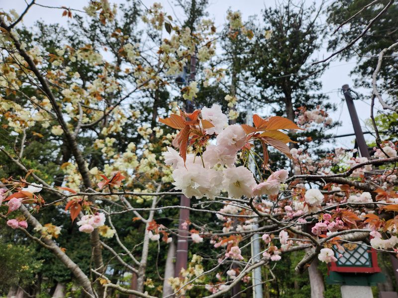 また、神社桜苑でも八重のサトザクラ系が見ごろとなっています。芳香が魅力の匂いサクラも咲いていますので、ぜひ近くに寄って各々に特徴のある桜をお楽しみください。