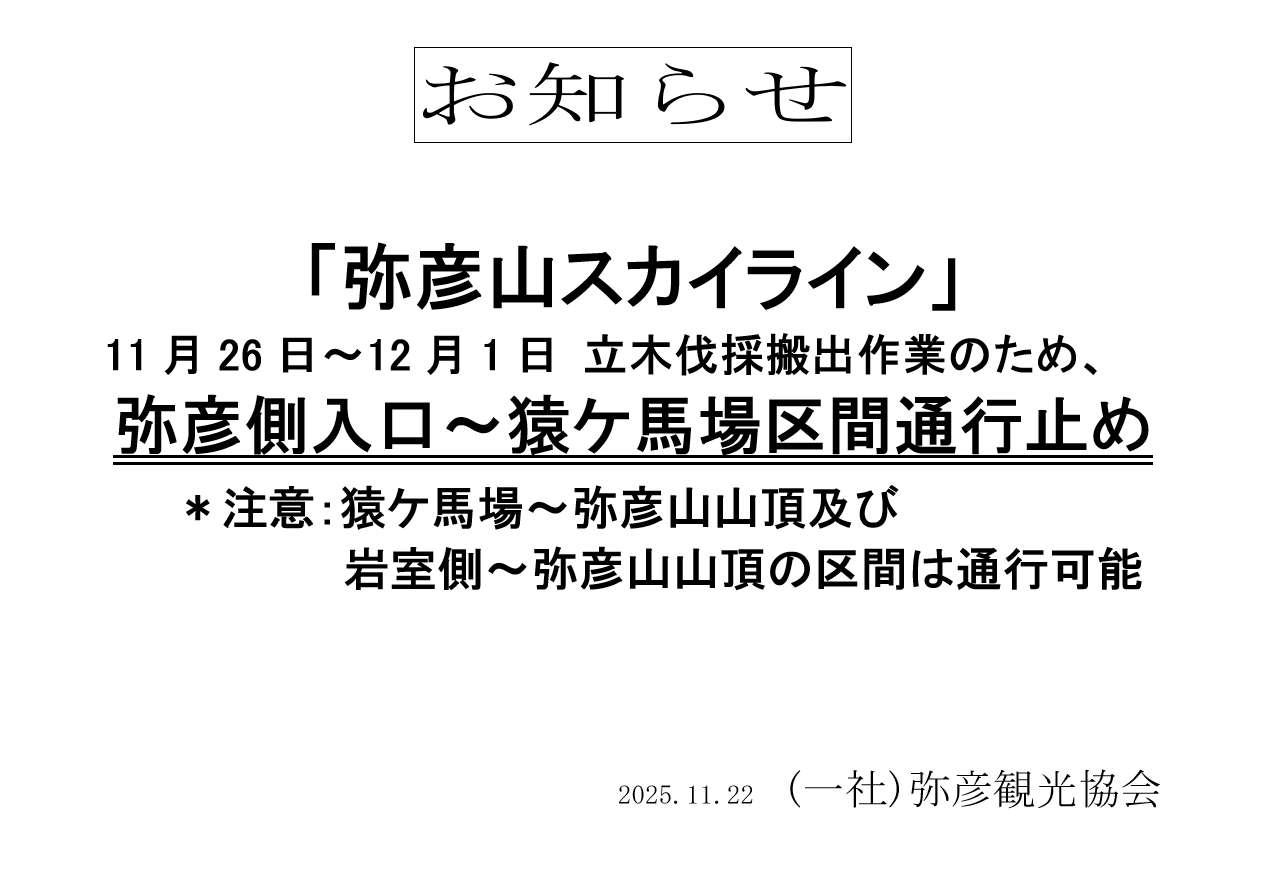 【2025.11/26~12/1弥彦山スカイライン≪弥彦側入口-猿ケ馬場区間≫通行止めのお知らせ】 2025.11.22 重要なお知らせ このたび、弥彦山スカイラインの通行に関して重要なお知らせがございます。 下記の期間中、立木伐採作業に伴い、一部区間が通行止めとなりますので、ご注意ください。 【通行止め期間】 2025年11月26日(水)~ 12月1日(月) 【通行止め区間】 弥彦側入口~猿ヶ馬場区間 【通行可能区間】 猿ヶ馬場~弥彦山頂及び岩室側~弥彦山頂の区間は通行可能