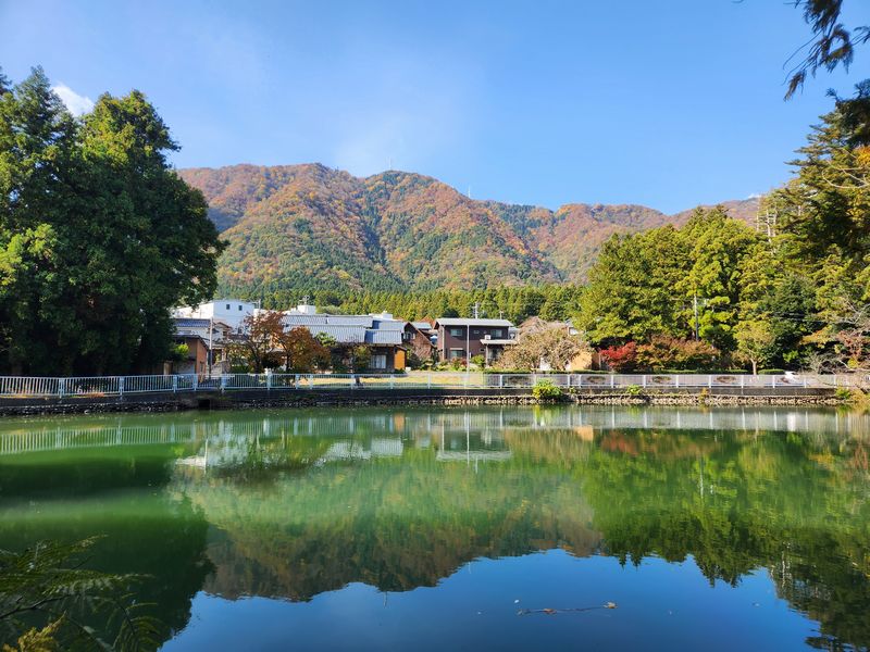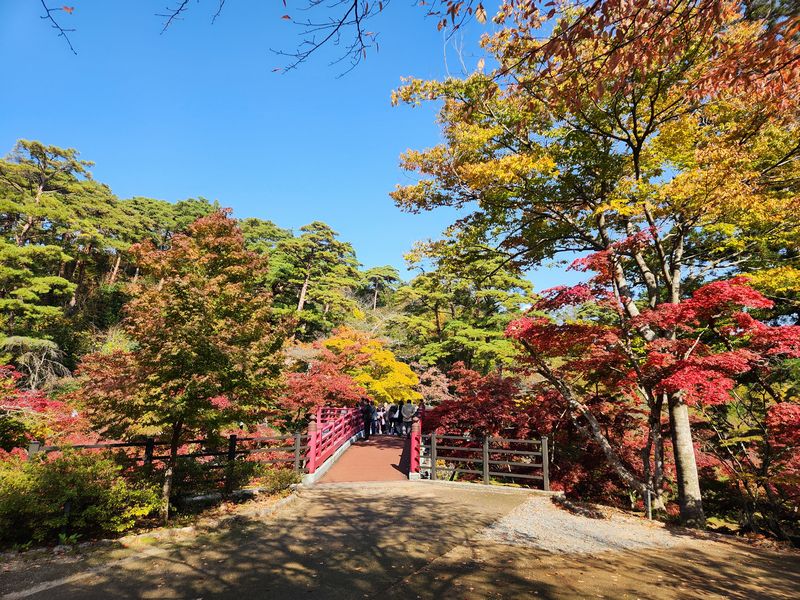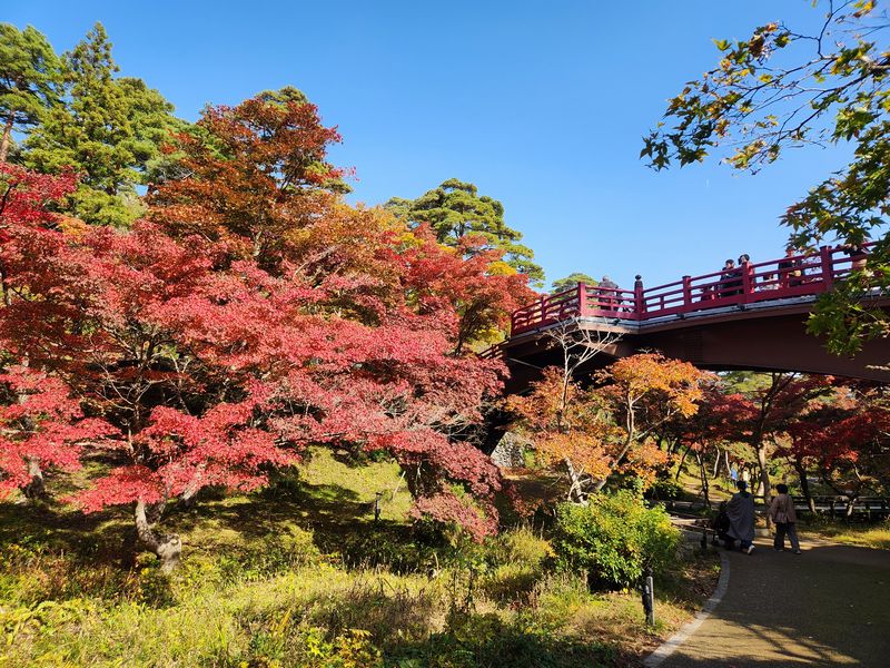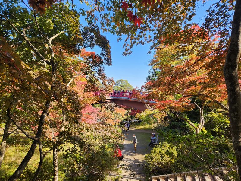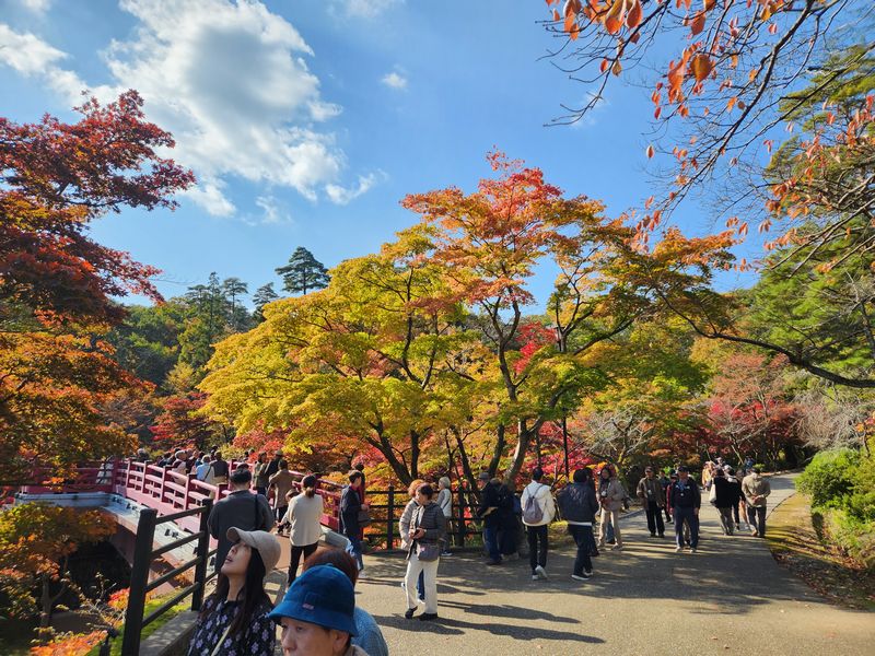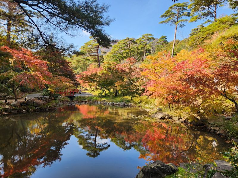 弥彦山の中腹より上では彩り鮮やかになってきており、観月橋周辺でも見ごろを迎えるものが増えてきました。全体的には、まだ緑色が多く残っており色づき5分程度といったところで綠・黄・橙・紅のグラデーションが楽しめる状態です。本格的な見ごろは、来週中半くらいからとなりそうです。