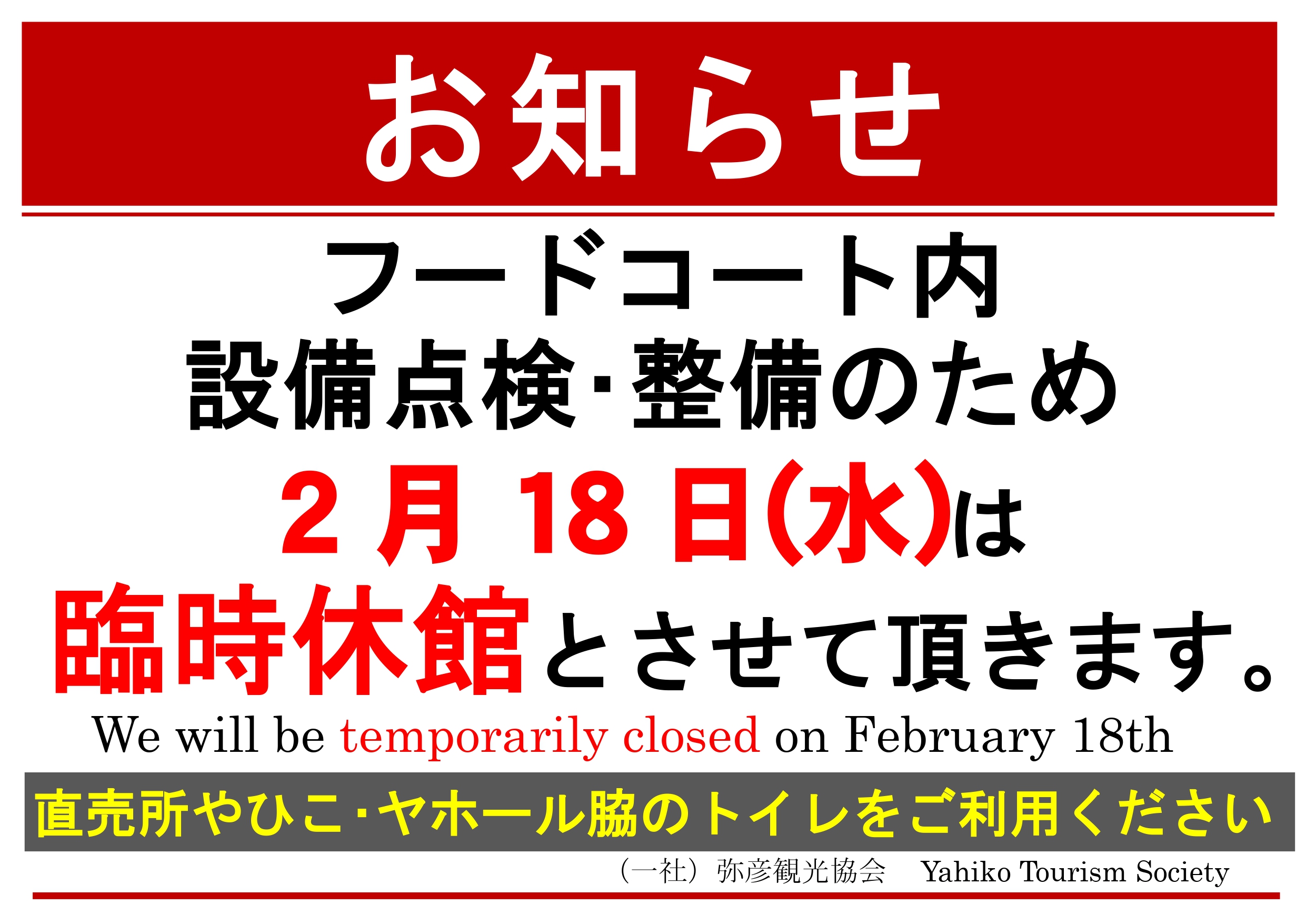 2026年2月18日(水)弥彦おもてなし広場フードコート 臨時休館のお知らせ