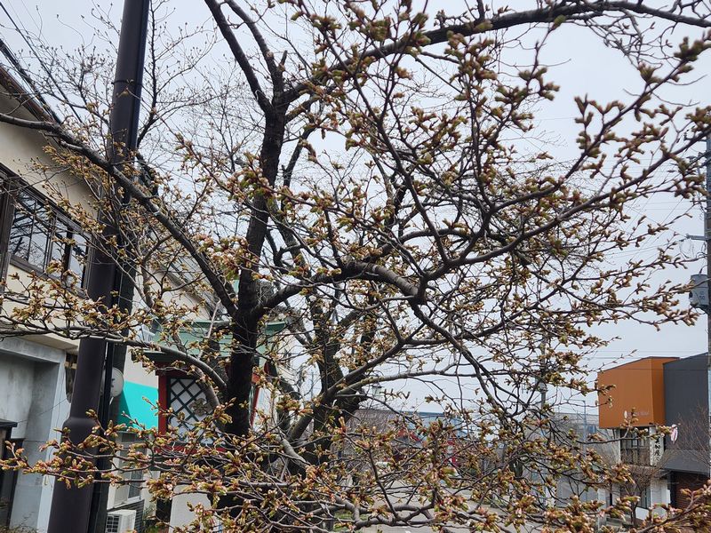 弥彦の街で一番早咲きの停車場通り彼岸桜がほころび始めました。例年この桜が見頃を迎えてから約1週間で染井吉野が咲き始めます。