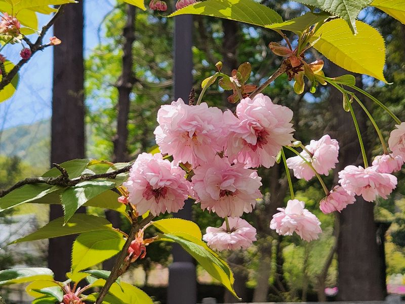 また、神社桜苑でも八重のサトザクラが見ごろとなっています。芳香が魅力の匂いサクラも咲いていますので、ぜひ近くに寄って各々に特徴のある桜をお楽しみください。