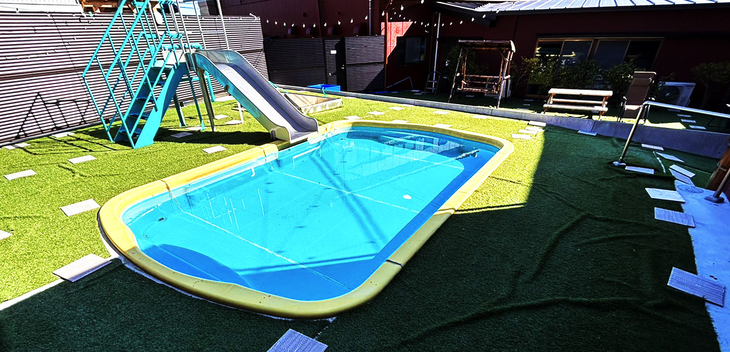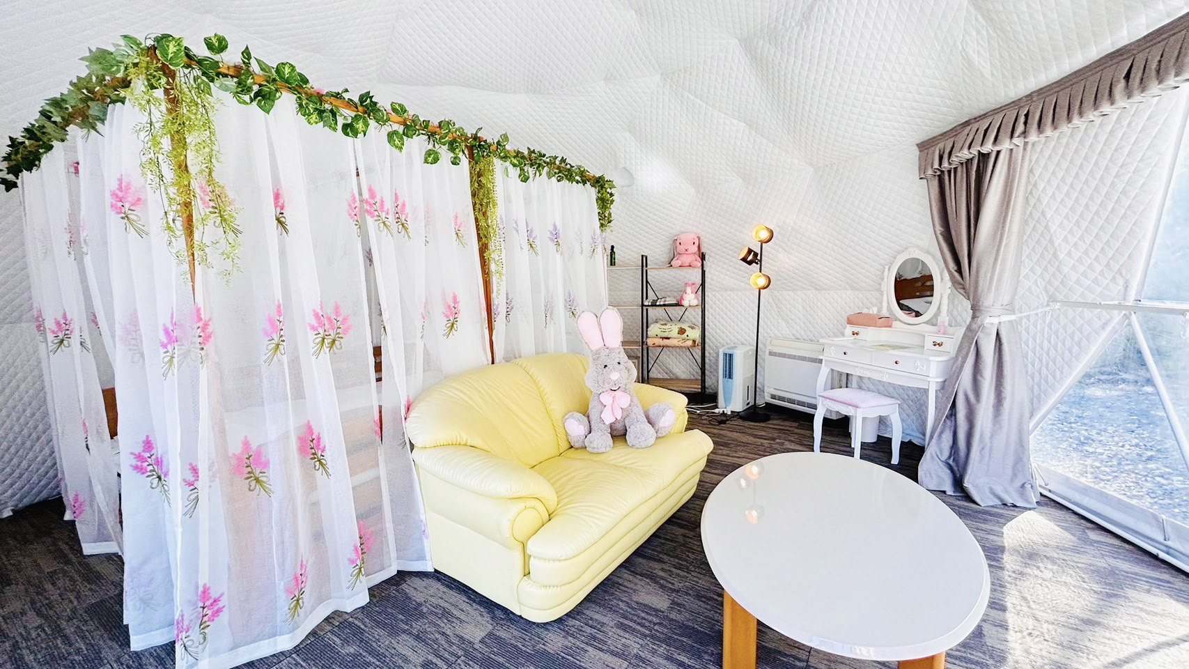 ホテルのようにくつろげるドームテントと最新の着衣サウナ、子どもに嬉しいプール。